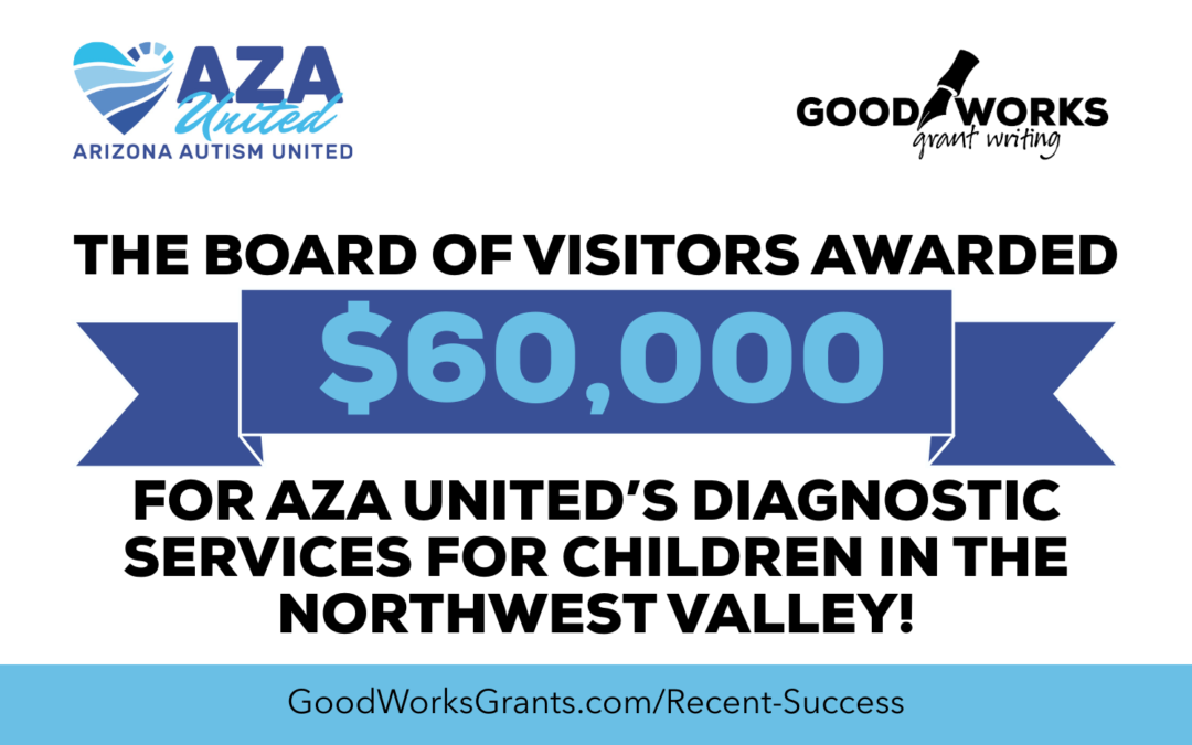 Overview of Use of Funds: Good Works Grant Writing is excited to congratulate our client, Arizona Autism United (AZA United), on being selected to receive a $60,000 grant from The Board of Visitors! This generous foundation grant will provide support for AZA United’s launch of a Diagnostic Clinic at their newly renovated North Valley Center (NVC) in Glendale, Arizona. Notably, this clinic will also feature a unique Diagnostic Training Program, which will help develop a pipeline of providers in this specialty. The NVC will build AZA United’s capacity to address a pervasive gap in diagnostic services for families living in the Northwest Valley region of Maricopa County.